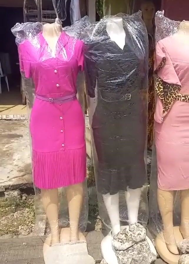 row of mannequins standing outside a store, displaying dresses. The mannequins are arranged in a line and are each dressed in a different style of dress. The first dress is a bright pink, knee-length dress with a collared neckline, short sleeves, and a pleated hem. It is fastened with buttons down the front and has a thin matching belt. The second dress is black, also knee-length, with a v-neck and a slim belt. The third dress is a pale pink, form-fitting dress with wide, flowing sleeves finished with a leopard-print trim, and a matching leopard-print belt. All the mannequins are covered in clear plastic wrapping. They are standing on different types of supports, some of which are concrete and others appear to be piles of rocks. Behind the mannequins, there is a covered area that seems to be part of the store, where more clothes can be seen hanging. The ground in front of the mannequins appears to be partially paved.