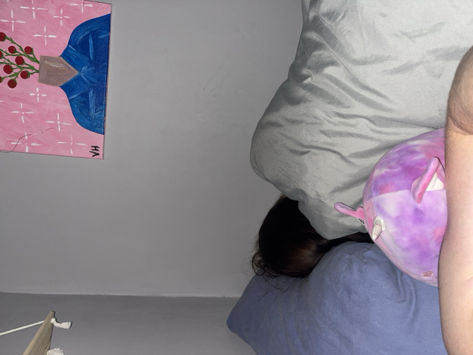 A person lies on a blue pillow, obscured by a large grey pillow and a purple tie-dye plush toy. Only a small section of dark hair is visible. A partial view of a fair-skinned arm is on the right. In the background, a grey wall has a painting of red berries in a vase, on a pink patterned background with blue highlights. A portion of a small white and wooden structure is at the bottom left.