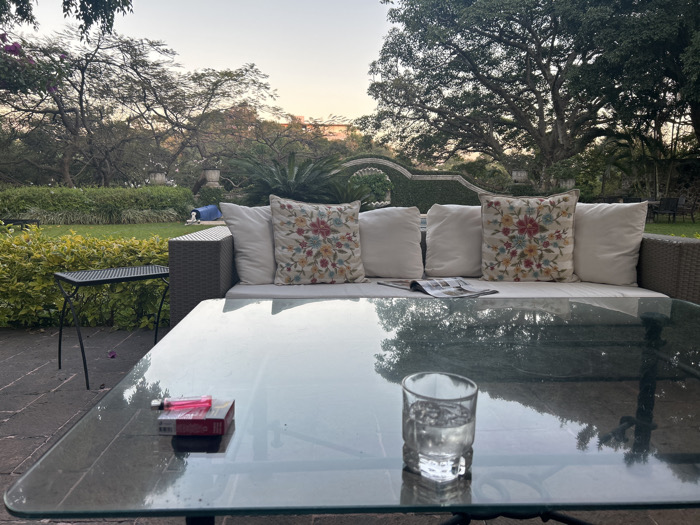 A serene patio setting features a glass-topped table with a glass of water, a pack of cigarettes, and a lighter. Behind the table, a wicker sofa with floral cushions rests on the patio. A small black table stands to the left. A lush green lawn, hedges, and mature trees form a backdrop to this tranquil outdoor scene. The photo is taken during dusk.