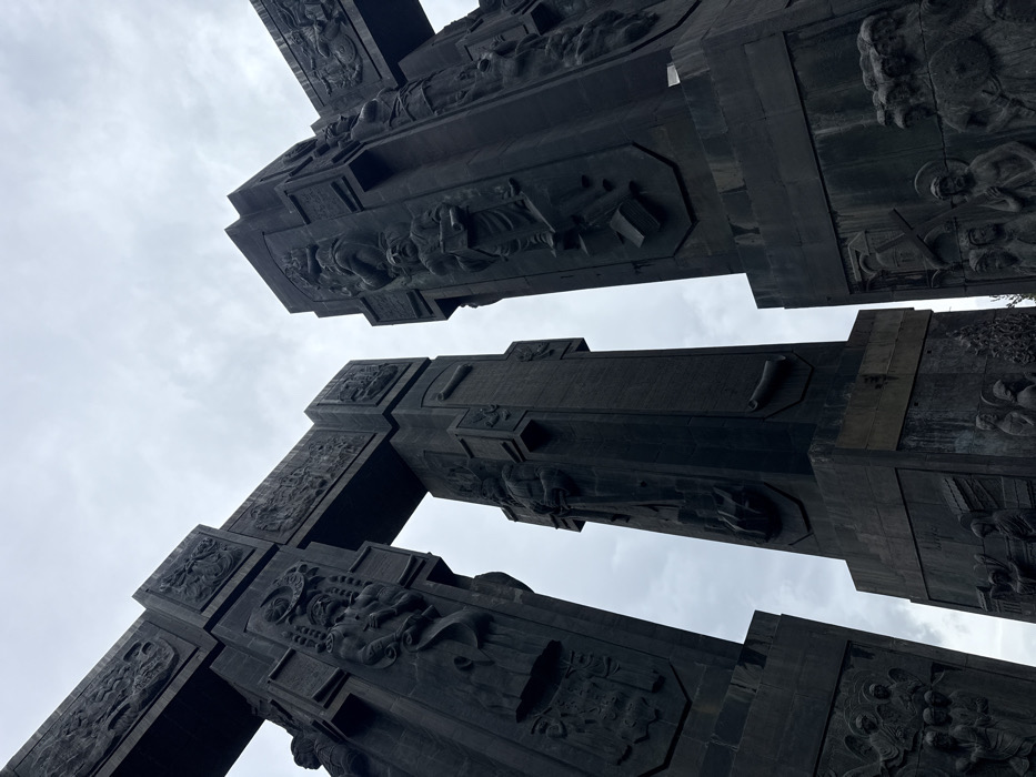 The image displays a low-angle perspective of the Chronicle of Georgia (also known as the History Memorial of Georgia), located on a hill overlooking the Tbilisi Sea in Tbilisi, Georgia. The scene features multiple massive, dark, rectangular stone or bronze pillars rising towards an overcast, uniformly gray sky. These pillars are interconnected by horizontal beams, creating a monumental, open-air structure. Each visible pillar surface is extensively covered with intricate, high-relief carvings. These reliefs depict numerous human figures in various poses, representing scenes and individuals from Georgian history, mythology, and Christianity. Details observed include robed figures, some with halos signifying saints, others appearing as historical leaders, warriors, or common people. Specific panels show individuals holding scrolls, books, or engaged in group interactions. The dark material of the monument contrasts with the bright, diffused light from the cloudy sky, enhancing the depth and detail of the carvings. No people are visible in the immediate vicinity of the monument, which dominates the frame from this worm's-eye view.
