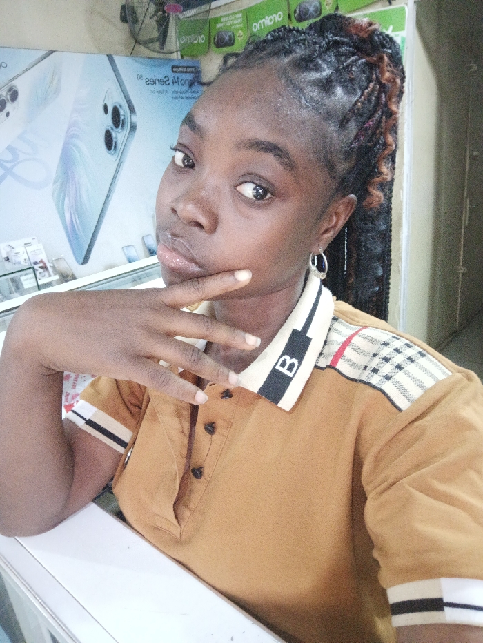 A young woman poses indoors. She has dark hair styled in braids with red highlights. She wears silver hoop earrings and a tan-colored polo shirt with a plaid and black collar detail. Her hand is raised to her face in a playful pose. Behind her, a smartphone advertisement is visible, suggesting she is in a mobile phone store.