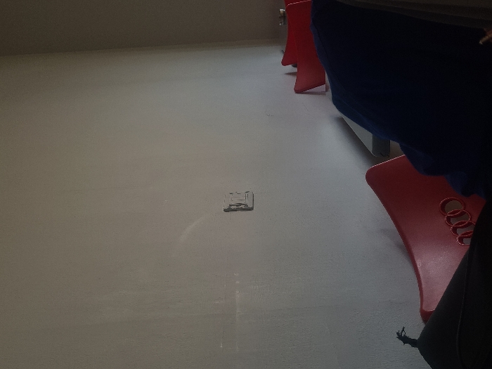 The scene depicts an interior space, specifically located in Jibb as-Safa, Syria, likely a classroom or lecture hall. A light-colored, possibly off-white or light gray, wall dominates the upper and left sections of the image. Centered on the wall, slightly below the vertical midpoint, is a single electrical fixture, resembling a light switch or outlet plate, which is also light in color. Below this, in the mid-ground, a series of red plastic chairs are arranged in rows, with gray-topped tables positioned in front of them. The chair in the immediate lower-left foreground is red and features four embossed, interlocking rings (the Audi logo) on its backrest. Further to the right in the foreground, a dark blue fabric object, possibly clothing, partially obstructs the view of subsequent chairs and tables. In the extreme lower-left corner, a small, dark, humanoid figurine, appearing to hold a rifle, rests on an unseen dark surface. No individuals are visible.