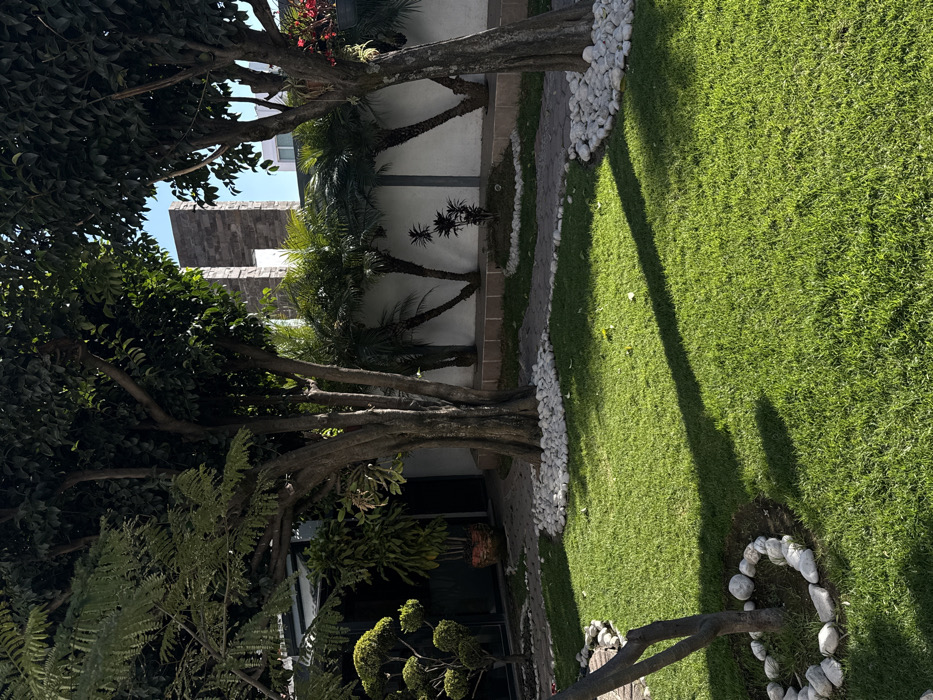 Lush green lawn abuts a pathway lined with white stones. Trees with leafy canopies cast long shadows across the grass. A building with a stone facade peeks through the foliage in the distance. Palm trees stand against a white wall, adding a tropical element. Manicured greenery is evident, with topiary shrubs visible near a dark doorway. The overall scene evokes a serene and well-maintained outdoor space.