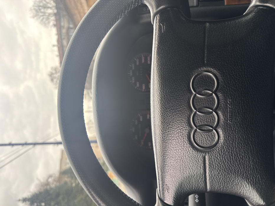 The image presents a first-person perspective from the driver's seat of an Audi vehicle, located in the city of Pazardzhik, Bulgaria. The central foreground is dominated by a black, textured leather steering wheel, which features the Audi four-ring emblem and the word "AIRBAG" embossed on its central airbag cover. A small scuff or tear is visible on the upper right quadrant of the airbag cover. The upper rim of the steering wheel exhibits a perforated texture. Behind the steering wheel, sections of the instrument cluster are visible, displaying two analog gauges with dark backgrounds, white numerals, and red indicator needles, suggesting the vehicle is stationary or at a low speed. A control stalk is partially visible on the left side of the steering column. A segment of wooden interior trim is discernible on the far right. Beyond the windshield, an overcast, light grey sky is visible, indicating cloudy conditions. The exterior environment includes bare deciduous trees and a conifer on the left, alongside overhead power lines supported by a utility pole. In the mid-ground, elements of multi-story buildings with light-colored facades and tiled roofs are apparent. No people are visible within the frame.