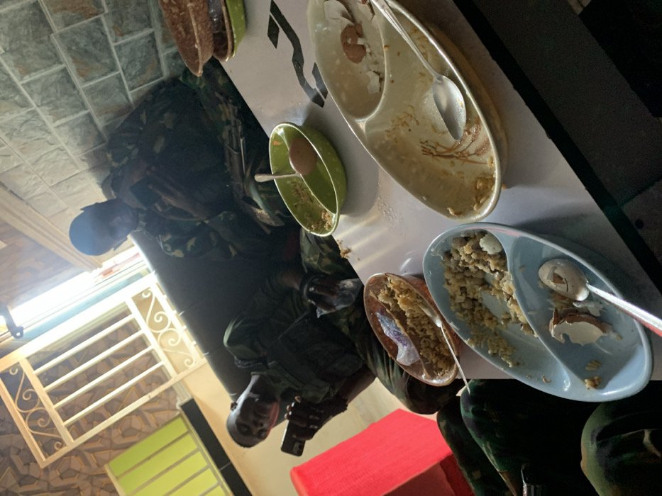 Located indoors in Zaki Biyem, Nigeria, two adult males in military-style camouflage uniforms are seated on a dark-colored sofa. The individual on the left holds a smartphone in his left hand, looking at the screen, with a small plastic bag in his right hand. The individual on the right also holds a smartphone with both hands, focusing on its screen. They are positioned around a light-colored table in the foreground, laden with multiple used and partially consumed food dishes. These include several two-compartment oval plates containing remnants of rice, chickpeas or beans, and eggshells, along with spoons. One green two-compartment dish holds a whole brown egg alongside leftover food. The immediate background features a wall with gray stacked stone or tile pattern and a window with an ornate, light-colored metal security grill, allowing natural light into the room. A red object, likely a cushion or chair, is visible on the far left.