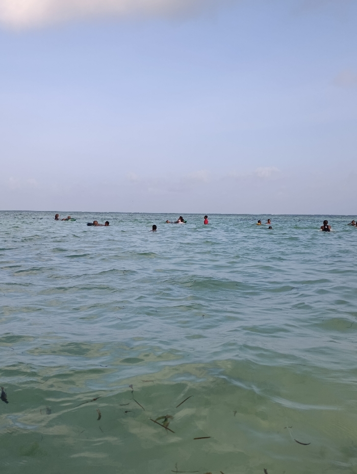 The image depicts a coastal scene in the Makadara/Mji Wa Kale ward, Kenya. Approximately 15 to 20 individuals are observed in a greenish-blue body of water under a light blue sky with minimal cloud cover. The water surface exhibits ripples and small waves, with dark strands of seaweed or sea grass floating in the foreground. The individuals, primarily visible from the shoulders up, are dispersed across the midground, engaged in swimming or wading activities. Most wear dark-colored swimwear; one person on the far right wears a red top. One individual on the left side appears to be utilizing a light-colored flotation object. No distinct interactions or specific objects beyond the aforementioned are clearly discernible.