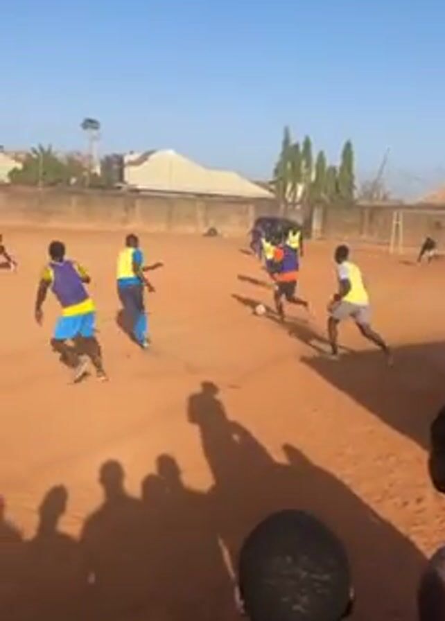 group of young men playing soccer on a dirt field on a clear, sunny day. The players are wearing different colored uniforms, including blue and yellow and orange and yellow. The field is surrounded by a low wall and some buildings are visible in the background. The camera is held by someone standing near the edge of the field, and their shadow is visible in the foreground. The players are actively moving around the field, passing and kicking the ball. There is a soccer goal at one end of the field.