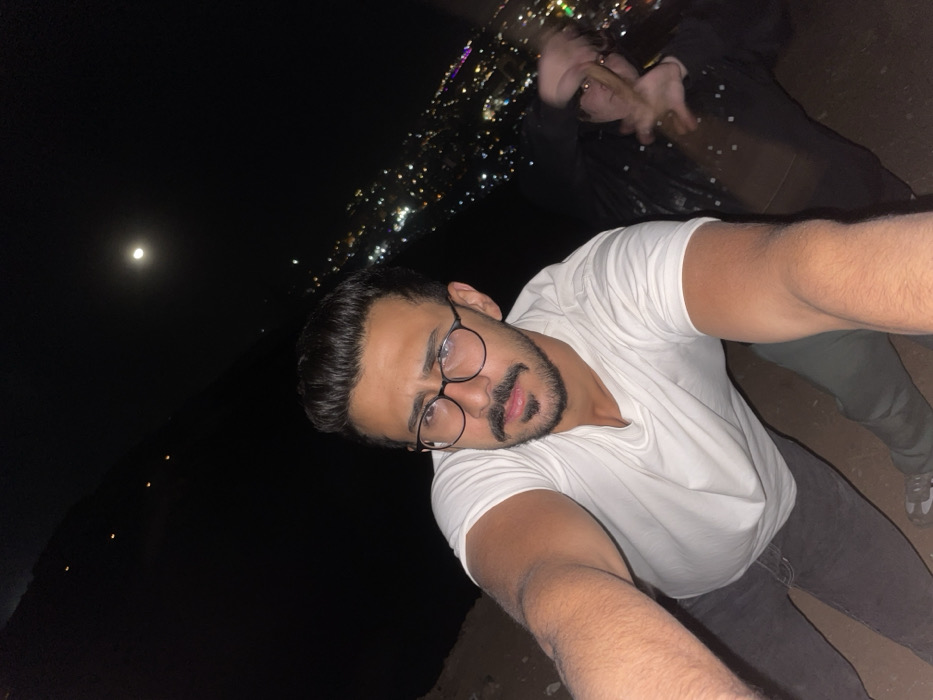 A nighttime photograph taken from an elevated outdoor location in Dummar Municipality, Syria, overlooking a city illuminated by numerous artificial lights. The full moon is visible in the upper right sky. In the foreground, a young adult male with dark hair, a beard, a mustache, and round eyeglasses is taking a selfie, extending his left arm. He wears a white short-sleeved t-shirt and dark pants, looking directly at the camera with a neutral expression. To his right and slightly behind him, a second individual, wearing dark clothing and glasses, is significantly motion-blurred, appearing to perform a hand gesture with both hands. The immediate ground surface is unpaved dirt or rock.