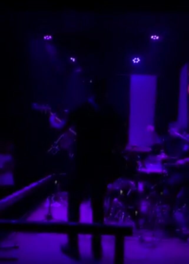 band performing on a stage, illuminated with purple lighting. The band members are silhouetted against the darkness, with a guitarist in the foreground. The stage setup includes drums, keyboards, and other instruments, with a low barrier in front. A young child stands to the left. The lighting includes spotlights and ambient purple hues.
