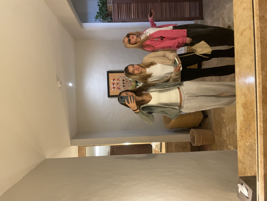 Three women are reflected in a mirror. The closest woman holds a phone, apparently taking a photo. She wears a denim jacket, white top, and grey sweatpants. Behind her, the second woman wears a white top and tan cardigan. The furthest woman wears a pink sweater with a cherry on it, a white top, and sunglasses. They are indoors with a woven chair and basket visible. An artwork hangs on the wall.