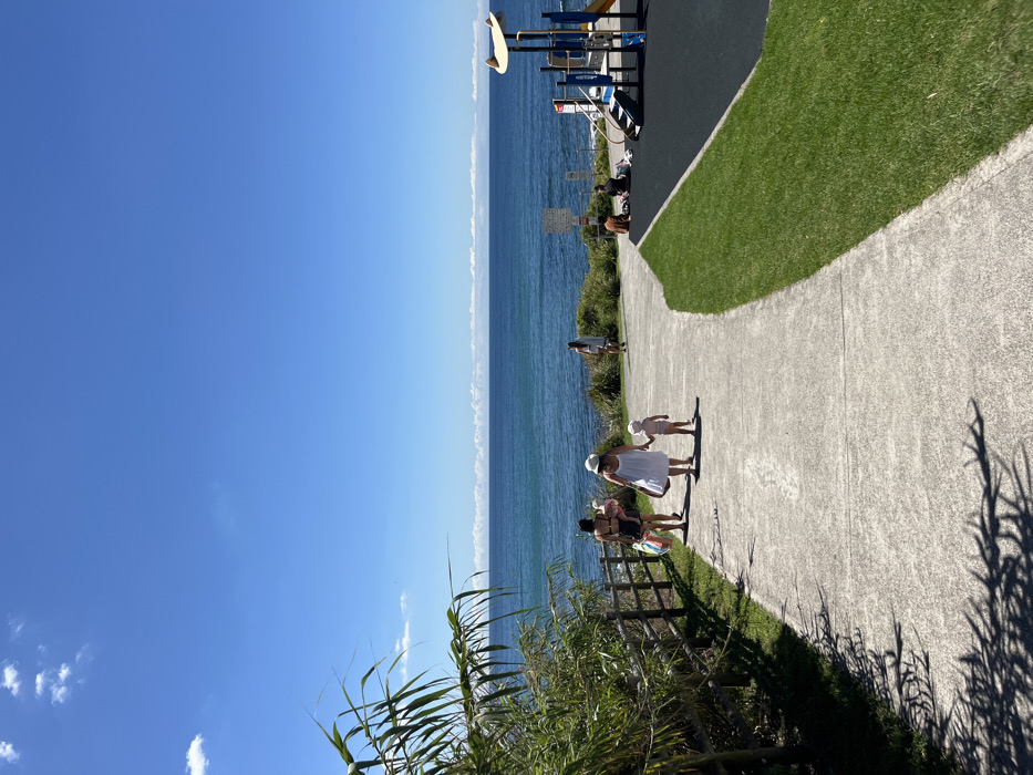 A coastal scene shows a paved pathway alongside the ocean. Several people walk along the path, including a woman in a white dress and hat holding a child's hand. Lush green grass and vegetation line the pathway. In the background is the deep blue ocean meeting a clear blue sky. A playground structure is visible in the upper portion of the image. A wooden fence and tall reeds are in the foreground.