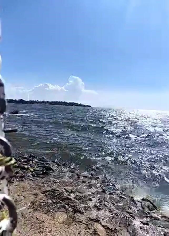 sunny day at the coast. The camera pans from a close-up of a metal chain decorated with plastic flowers toward a view of the sea. The waves are visible, and sunlight glints on the water. A small island is visible in the distance. The camera movement reveals a metal structure with a wooden deck built into the water. The coastline is rocky and sandy.