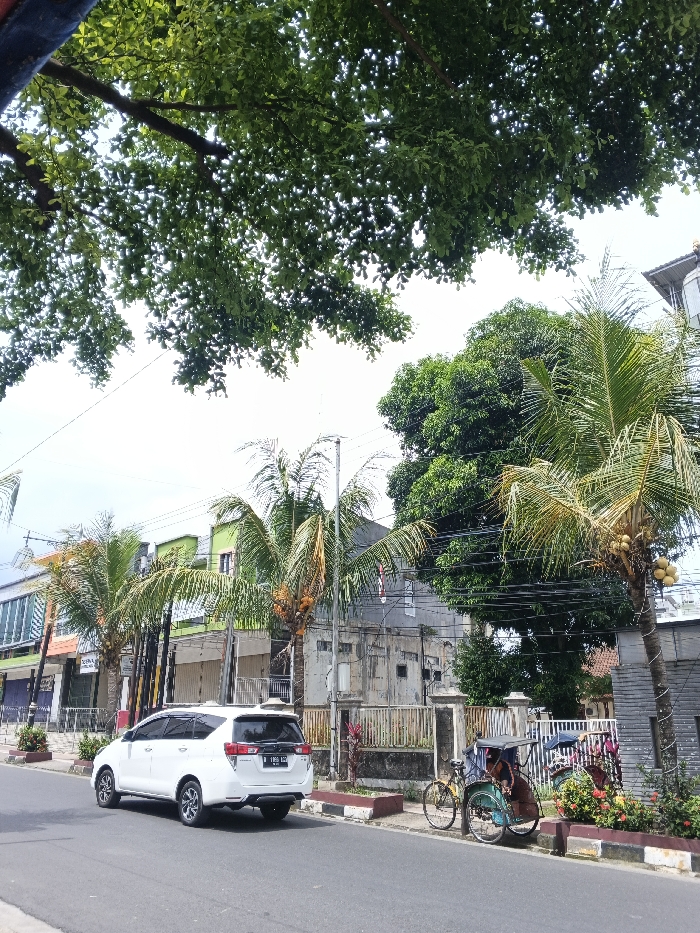 A white SUV is parked on the side of an asphalt road beside a curb with a bicycle and a three-wheeled bicycle near it. Palm trees line the street with commercial buildings behind them. Lush green trees overhang the scene, filling the upper portion of the view. A fence separates the buildings from the sidewalk, and the sky is partly cloudy.