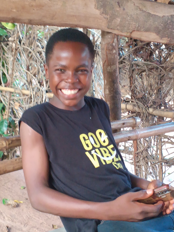 A young individual, appearing male, with dark skin and short dark hair, is pictured from the chest up, seated and smiling broadly directly at the camera, revealing teeth