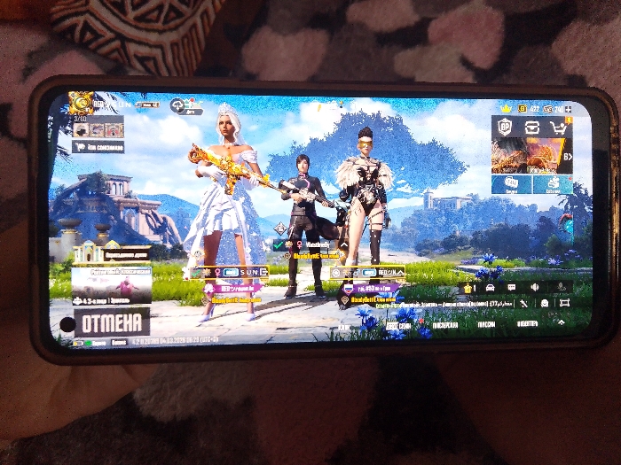 A dark-colored smartphone, held horizontally by an individual's left hand, displays a video game interface. The phone is positioned on a textile surface featuring a repeating geometric pattern in dark and light brown tones. The game screen depicts three virtual characters standing on a grassy plain with sparse blue and purple flowers. The character on the left is a female with long white hair, wearing a white gown and crown, holding a golden assault rifle. The central character is a male in dark tactical attire, holding a dark assault rifle. The character on the right is a female with dark hair, wearing an intricate black, revealing outfit with feather-like embellishments. The virtual background behind the characters shows a serene landscape with ancient-style stone structures on elevated terrain, lush green vegetation including palm trees, distant mountains, and a body of water under a bright sky. Various game user interface elements overlay the scene, including player names, icons for game modes, currency, and a visible "OTMEHA" (Russian for "CANCEL") button in the lower-left corner. A timestamp "04.02.2023 00:29 (UTC+3)" is partially visible. The scene is located in Kuyeda, Russia.
