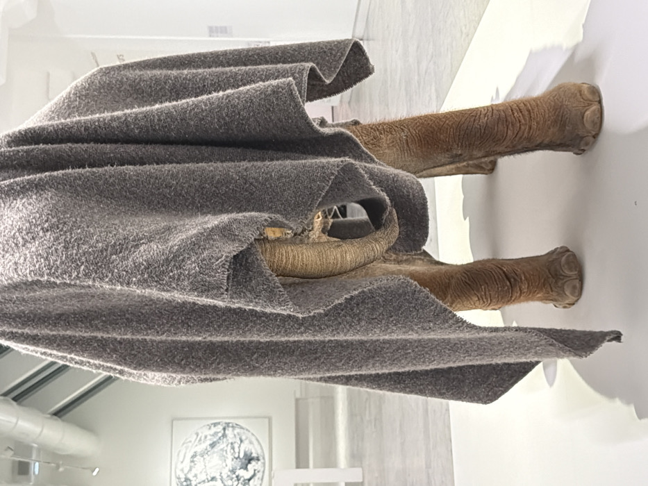 The image displays an art installation within the Mucem (Musée des Civilisations de l'Europe et de la Méditerranée) in Marseille, France. A taxidermied or sculpted elephant, identified as Maurizio Cattelan's "L'Homme au sac," stands on a white, rectangular plinth. The elephant's main body and head are entirely draped and concealed by a thick, heather gray woolen blanket, which hangs in folds. Visible elements include the elephant's four textured legs and feet, displaying wrinkled skin and toenails. A segment of the elephant's trunk is also visible, curled inward beneath the blanket's front edge. The environment consists of a well-lit interior space with white walls and a light-colored floor. In the background, a large, circular, monochromatic artwork is mounted on a white wall to the left. Exposed ceiling ductwork and artificial lighting fixtures are visible overhead. Faint text, likely exhibition signage, appears on a distant wall to the right. No human figures are present in the frame.