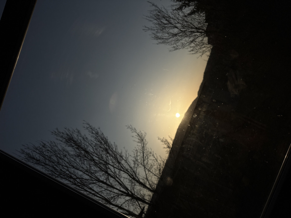 The image displays an outdoor scene, likely a sunrise or sunset, viewed through a glass pane exhibiting multiple translucent smudges and faint reflections