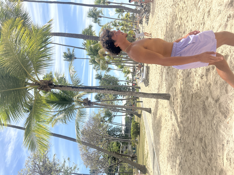 The image depicts a sunny beach scene in Sainte-Anne, France, characterized by extensive light-colored sand and numerous palm trees. In the foreground, a young adult male with a medium complexion and dark, curly hair is walking from left to right across the sand. He is shirtless, wearing light purple swim shorts, and has a thin gold chain around his neck. His body is in profile, and he is looking towards the right side of the frame. The environment includes a dense collection of palm trees with green fronds, providing dappled shade across the sand. In the mid-ground to the left, a paved pathway separates the sandy beach from a manicured grassy area. Beyond the lawn, a multi-story building complex with white walls and dark roofs is visible, consistent with a resort or hotel. To the right, numerous grey and white striped lounge chairs are arranged on the sand; some are occupied by indistinct figures. Other individuals are visible further in the background, with one person in a light-colored garment standing. The sky is clear blue with scattered white, wispy clouds. Shadows from the palm trees are cast upon the sand.