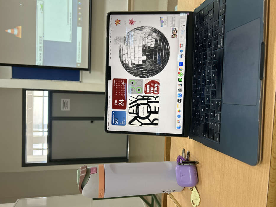 The image depicts an interior scene, likely a classroom or lecture hall, in Jerez de la Frontera, Spain. In the foreground, a dark blue MacBook Air, protected by a clear case and featuring a Spanish keyboard layout, is open on a light-colored wooden desk. Its screen displays a desktop with widgets for weather (26°C and sunny in "Jerez de la Fro"), date (Friday, October 24, 12:38), and various applications, dominated by a large silver disco ball image. To the left of the laptop, a white "Owala" brand water bottle with a multi-colored lid stands beside a purple AirPods case. Attached to the AirPods case is a set of keys on a purple coiled lanyard, including a yellow/gold bell-shaped keychain. The background features a double door with a dark frame and light grey panels, topped by a transom window. To the right, a white projector screen displays a VLC media player interface, indicated by its orange traffic cone icon, showing indistinct content with a timeline and playback controls. A blue vertical panel is partially visible between the door and the projector screen. No people are visible in the frame.