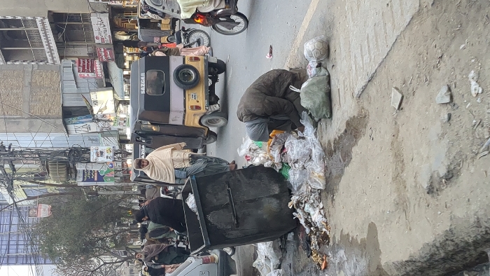 This image depicts a bustling urban street scene in Quetta City Tehsil, Pakistan. In the foreground, a large, dark-colored industrial waste bin lies overturned on its side, spilling a significant volume of refuse onto a dirt and cracked concrete sidewalk. The spilled contents include numerous plastic bags, organic waste, and other discarded items. A person, dressed in a dark, possibly olive-green, padded jacket and a light grey head covering, is kneeling on the ground amidst this trash, actively sifting through it with their hands. Adjacent to this individual on the ground is a green fabric bag and a partially deflated white soccer ball. The ground around the trash is visibly dirty, with patches of moisture. In the midground, the street features a yellow and black "SAZGAR" brand auto-rickshaw with a spare tire mounted on its rear. A male figure, wrapped in a light-colored shawl over traditional clothing, walks away from the camera, passing by the rickshaw. Other pedestrians, primarily men in traditional attire, are visible further along the street. Several motorcycles and a light-colored vehicle are also present. The background reveals a dense urban environment with multi-story buildings lining the street. These structures house various businesses, indicated by signs in both Urdu and English (e.g., "ZK," "SHOE CLUB"). The architecture varies, including older concrete buildings with balconies and more modern glass facades. A complex network of overhead electrical wires and utility poles is prominent against the sky. The overall scene suggests a busy commercial district with active street life and challenges related to waste management.