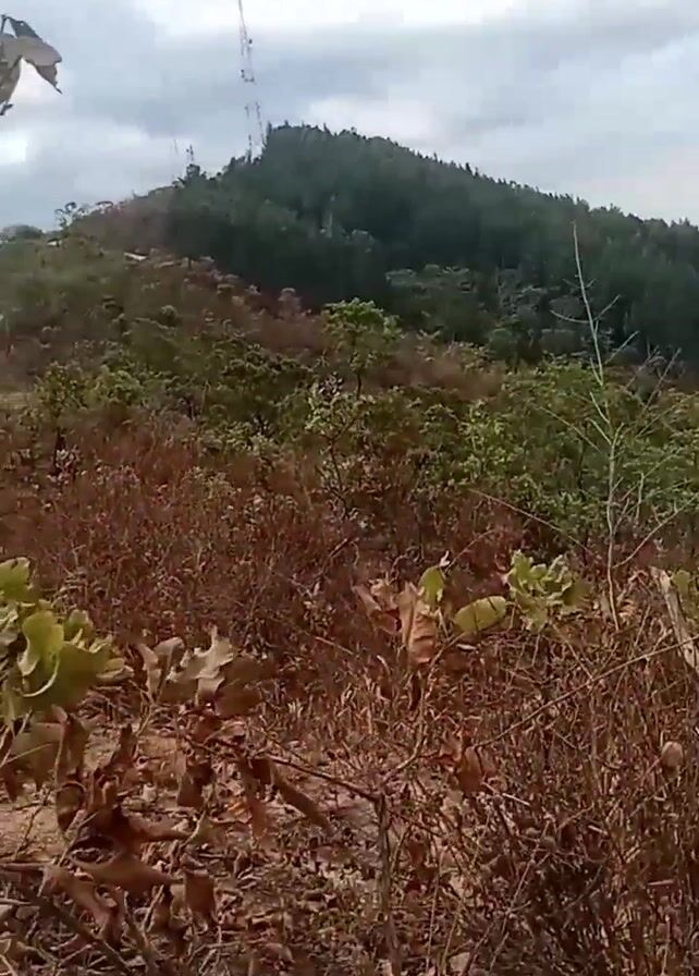 landscape view of a hill with trees and vegetation, appearing dry with brown leaves in the foreground. A hill covered in green trees is in the background, with two telecommunications towers visible at the summit. The sky is overcast with grey clouds. The camera appears to be positioned lower on the hill, looking uphill towards the towers. The footage seems to be captured in a natural outdoor environment. A faint sound of music is barely audible.