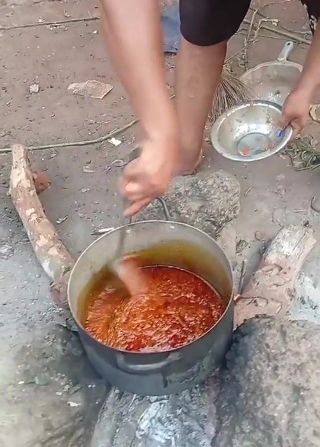A person stirs a large pot of red sauce over an open fire in a gritty outdoor setting