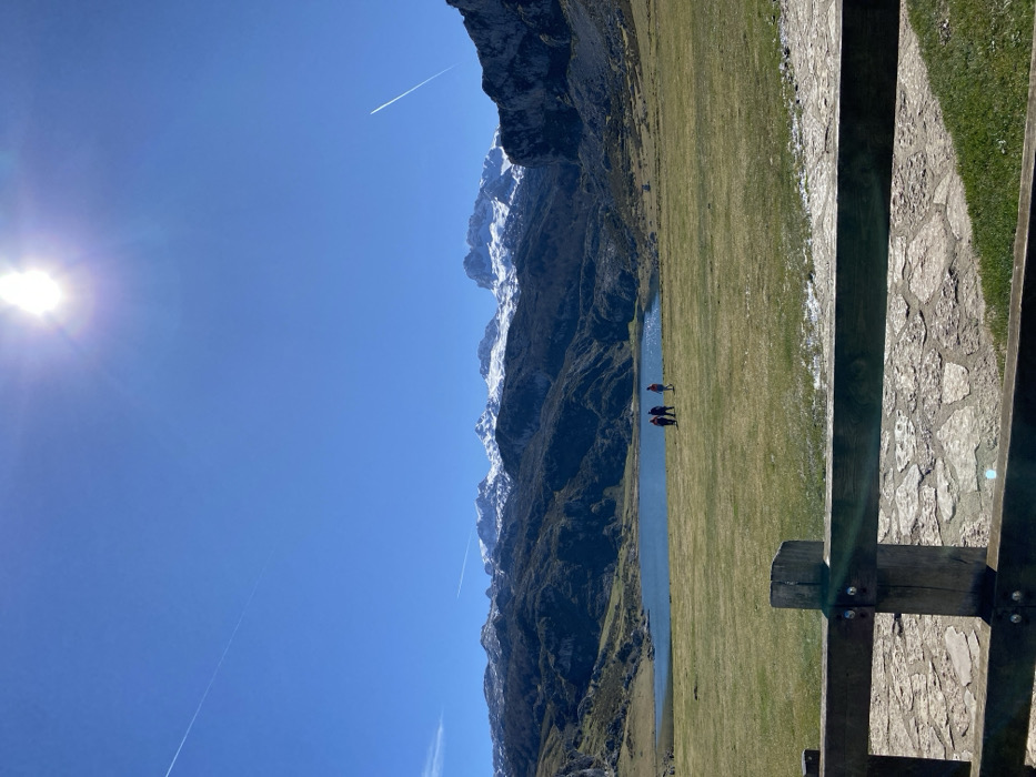 The image depicts an outdoor panoramic landscape, identifiable as the Picos de Europa National Park, specifically near the Covadonga Lakes area in Cangas de Onís, Spain. In the foreground, a wooden fence consisting of two horizontal dark brown rails and a lighter brown vertical post is visible, partially obstructing the lower portion of the frame. Metal fasteners secure the rails to the post. Immediately behind the fence, a paved path composed of irregular, light-colored flagstones extends across the width of the image. Patches of green grass are present along the path and the bottom edge. The midground features an expansive, flat area of light green grass leading towards a body of water. Four individuals are positioned on this grassy field, approximately equidistant from the viewer and the lake. They are depicted in various stages of walking towards the left. One person wears dark clothing, two wear red or orange jackets, and one wears light-colored clothing, possibly an orange shirt. Behind them, a calm, blue lake with an irregular shoreline is visible, partially reflecting the sky. The background is dominated by a rugged mountain range characterized by dark, rocky terrain. The highest peaks of these mountains are covered with visible snow, and the range spans the entire horizon. The sky is clear and blue. The sun, a bright luminous disc with radiating flares, is prominently situated in the upper right quadrant. Two distinct, thin white contrails are visible: one traversing diagonally downwards from the upper left, and another extending diagonally downwards from the upper right, near the sun. The scene is brightly lit under direct sunlight.