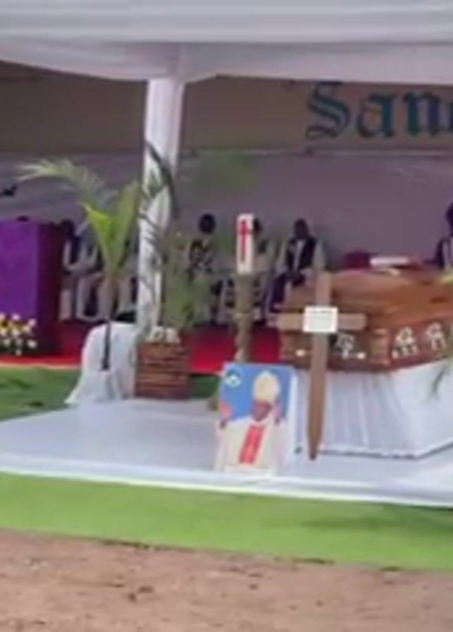 The scene shows a funeral service under a white tent with the word "Sanctuaire" visible in the background. A coffin rests on a white platform, adorned with a cross and flanked by greenery. A portrait stands in front of the coffin. Several people in religious attire sit in the background. In the foreground, two individuals wearing scout uniforms are present. The ground is a mix of green artificial turf and a reddish dirt area.