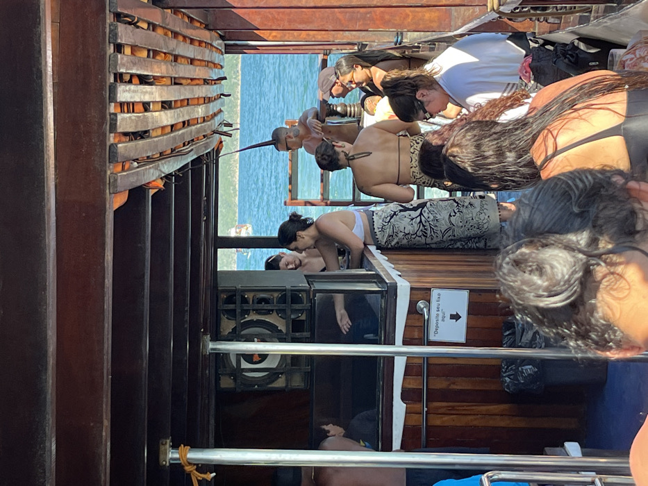 People are on a wooden boat. Several people are looking over the edge toward the water. Others are standing or sitting nearby. A speaker is visible. A sign on the wood paneling says, "Deposite seu lixo aqui" with an arrow pointing to the left. The sea can be seen in the background.