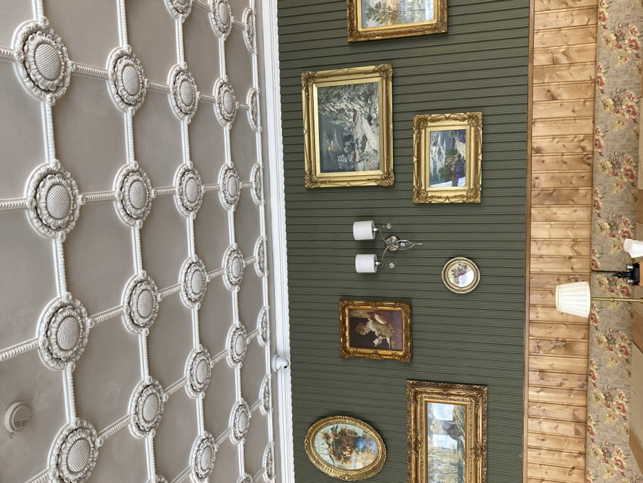 The scene depicts the interior of an establishment located in Gabrovo, Bulgaria. The ceiling is light-toned, adorned with an elaborate grid of white decorative molding featuring numerous circular, sunburst-like medallions. A white smoke detector and a white dome surveillance camera are mounted on the ceiling. The upper section of the wall is covered with vertical, olive-green ribbed paneling. Multiple ornate gold-framed paintings are displayed on this wall, including an oval floral still life, several rectangular landscape scenes (one featuring a winter setting, another with purple fields, and a third with figures by water), and a rectangular portrait of a seated woman. A two-light wall sconce with white fabric shades and crystal accents is mounted centrally on the wall. A horizontal light-brown wooden paneling forms the lower wall section, beneath which extends a continuous upholstered bench seat. The bench upholstery features a distinctive floral pattern in shades of red, orange, and green on a lighter background. In the foreground, a portion of a table is visible, upon which rests a brass-toned table lamp with a pleated white fabric shade, alongside black and clear condiment dispensers and a stack of white napkins. No individuals are present within the frame.