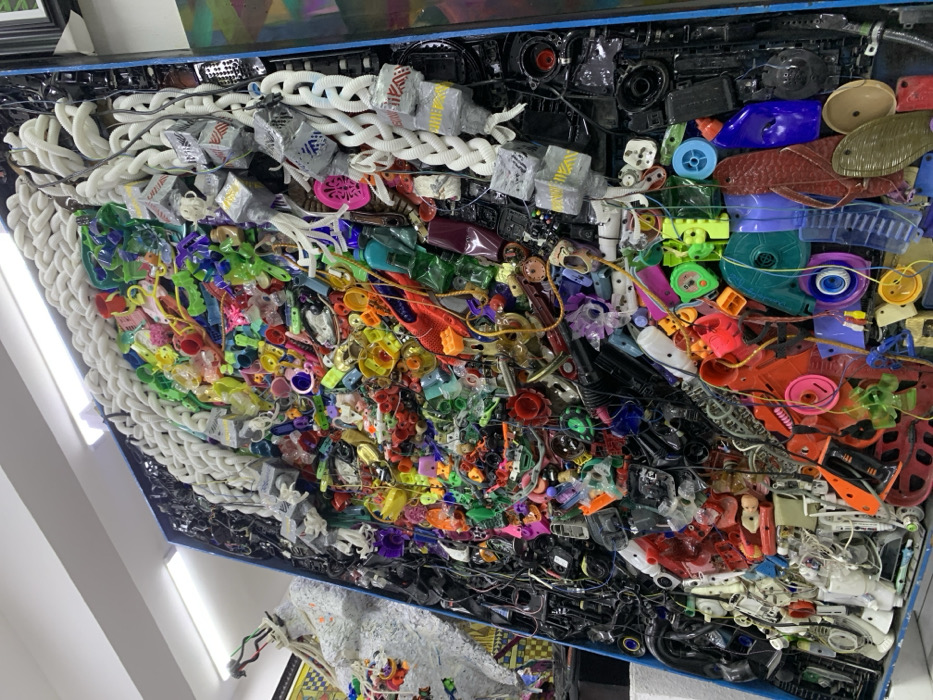 This image depicts an indoor art exhibition space situated in Ikate, Nigeria. The primary subject is a large, vertically oriented artwork, estimated at approximately 3 meters in height, meticulously assembled from diverse discarded plastic objects and electronic waste. The artwork portrays a highly abstract human face, with prominent white, braided plastic elements forming stylized hair or dreadlocks along the upper and lateral edges. The facial area is densely textured, comprising numerous small, multicolored plastic items, including bottle caps, toy components, various containers, and fragmented electronic parts. Specific colors visible include green, yellow, red, blue, orange, pink, black, and white. Several silver-colored, rectangular, foil-wrapped objects are integrated into the white braided sections. The entire piece is enclosed within a dark-colored frame. To the left of the main artwork, a large, textured white sculpture, also appearing to be constructed from repurposed materials, is partially visible. The floor is white, and the overhead lighting consists of multiple parallel fluorescent light fixtures. A small portion of a separate, patterned artwork is visible in the far-right background. No individuals are present, and no actions or interactions are depicted.