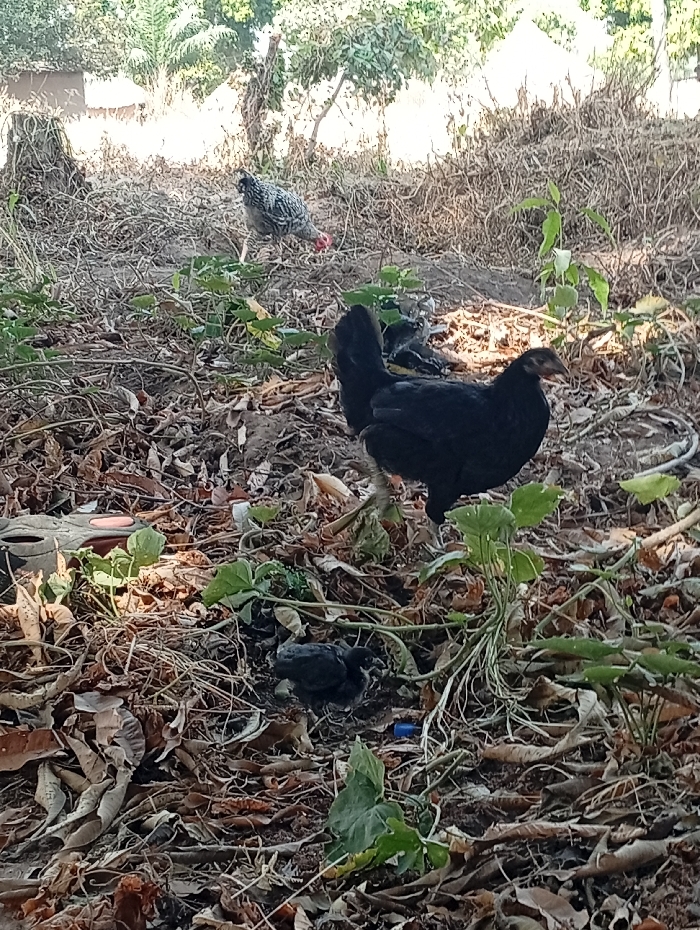 The image depicts an outdoor, uncultivated area in Zaki Biyem, Nigeria, illuminated by natural daylight. The ground is densely covered with dry leaves, twigs, and sparse green herbaceous plants. Three domestic chickens are visible: a black adult chicken stands in the lower right foreground, facing right; a small black chick is situated centrally in the lower mid-ground amidst the foliage; and a white and grey speckled adult chicken is positioned in the upper mid-ground, facing left, with a prominent red comb, actively foraging. A blue plastic bottle cap lies near the black chick, and a dark, worn object resembling a sandal fragment is visible on the far left. The background features a partial view of a light-colored building on the left, a tree stump, and dense, unkempt vegetation.