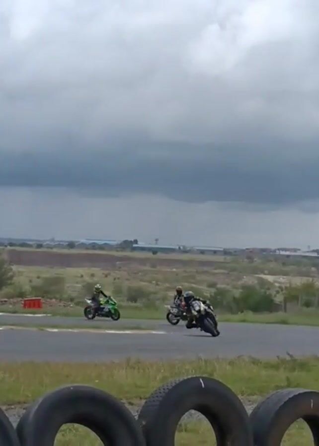 Three motorcyclists race on a paved track on a cloudy day. The track is lined with grass and a barrier of tires. The motorcyclists are wearing helmets and racing gear. The motorcycle in the lead is black with yellow trim. The following two motorcycles are green and red, respectively. In the background is a flat expanse with sparse vegetation and buildings on the horizon. The sky is heavily overcast with ominous gray clouds.