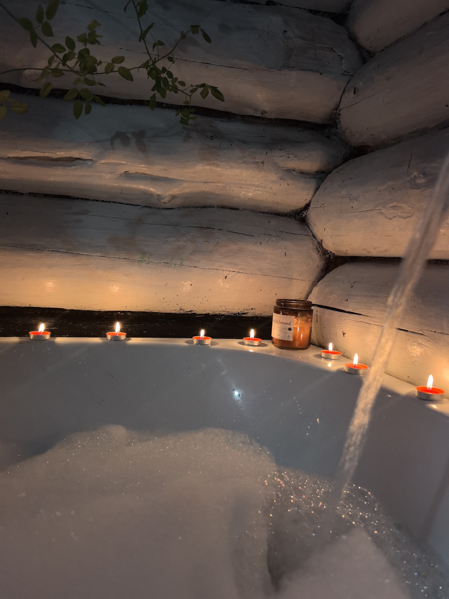 A dimly lit indoor scene depicts a bathtub filled with white foam, suggesting a relaxing bath setup. The tub is lined with several small, lit red candles, enhancing the ambiance. Next to the candles sits a jar labeled "Sandalwood." In the background, a wall is constructed of light-colored, rounded logs, reminiscent of a rustic cabin. Water is pouring into the tub from an unseen faucet. A green plant is partially visible above the wall on the left side. The location is not evident in the image. It is impossible to ascertain if the location is in the city of Noviy, Russia.