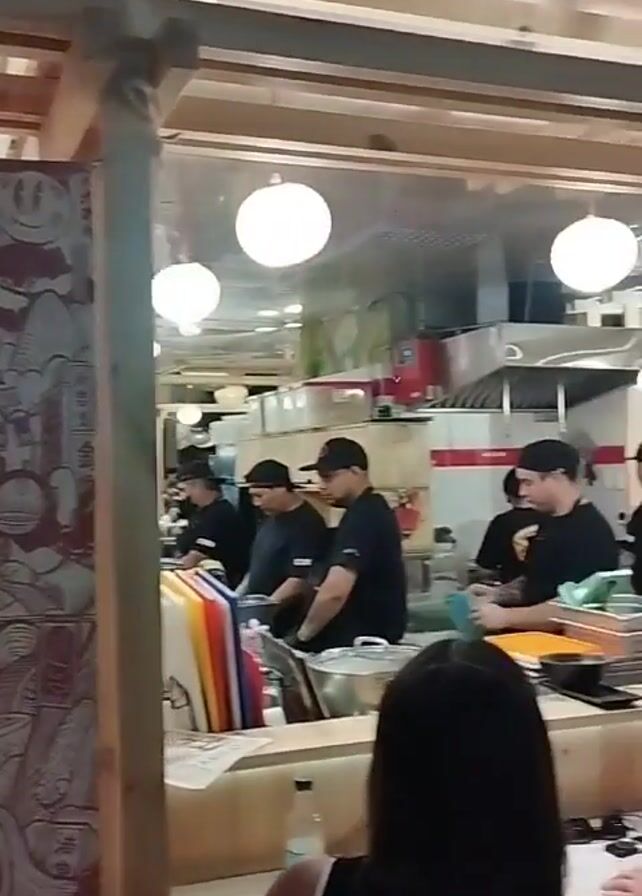 interior of a busy food hall or market. The camera pans across a long counter where chefs in black shirts and caps are preparing food, possibly Japanese cuisine, as indicated by the "ARIGATO" sign. Customers are sitting at the counter eating. In the background, other food stalls and patrons are visible. Overhead lighting includes round pendant lights and exposed wooden beams. A large banner with cartoonish drawings hangs from the beams near the counter. The general atmosphere is lively and bustling.