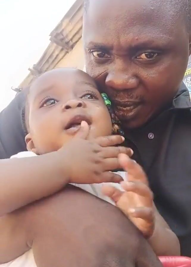 A man holds a baby in his arms. The man has dark skin, short, dark hair, and is wearing a black shirt. The baby has lighter skin, is wearing a white top, and has beads in their hair. The baby has their hand in their mouth, then begins to clap their hands together. The man looks down at the baby with a slight smile. They are outdoors, with a building visible in the background.