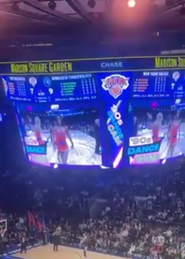 n overhead view of a basketball game at Madison Square Garden between the New York Knicks and the Minnesota Timberwolves. The score is 7-9. Overhead, on the jumbotron, the video shows two girls dancing on the '90s dance cam. The arena is crowded with spectators.