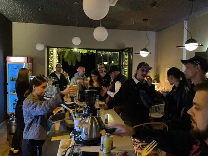The image captures an interior scene within a bar or cafe located in Rafailovići, Montenegro, at night. Approximately ten individuals are visible, predominantly standing around a brightly illuminated bar counter. In the left foreground, a woman with dark hair, wearing a gray quilted jacket, reaches over the bar, holding a glass filled with a light-colored beverage. To her left, another woman in a dark top stands near two red-framed glass-door refrigerators, one of which emits a blue light from its interior. The bar counter itself is occupied by various items, including a coffee grinder, an electric kettle, dispensers, bottles, glasses, citrus slices, and other bar equipment. A group of customers is positioned around the bar. This group includes a man wearing a black cap and glasses, looking towards the left; another man with a light pink beanie observing the counter; a woman in a black leather jacket holding a small glass; and a man in a black cap with white text, whose profile is visible on the right. In the lower right foreground, a bearded man in a dark shirt extends his right hand forward, holding a yellow utensil. The establishment features a dark ceiling with a speckled pattern, light-colored walls, and is illuminated by multiple spherical white pendant lights and smaller globe lights. Large glass doors or windows at the rear reveal an outdoor area characterized by illuminated trees, possibly palm trees, adorned with string lights, confirming the nighttime setting.