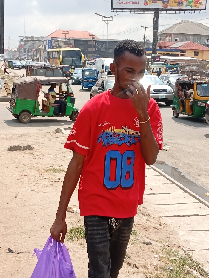 - "A slim man wearing a red t-shirt with "08" in blue and black jeans walks on a sidewalk holding a purple bag" by FM-kOvDM2, licensed under CC BY 4.0