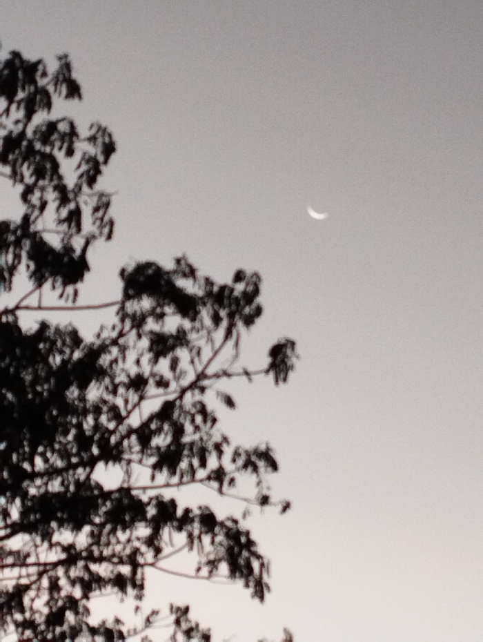 This image, captured in Guacara, Venezuela, displays an outdoor scene during twilight. The left and central-left portions of the frame are dominated by a dark silhouette of a tree, featuring numerous branches and dense foliage. The details of individual leaves are indistinct due to soft focus. The sky, appearing as a uniform light grey, fills the right half and upper portions of the image. A distinct, slender crescent moon is visible in the upper right quadrant of the sky. No people, man-made objects, or specific actions are identifiable within the frame. The lighting conditions suggest either dawn or dusk.