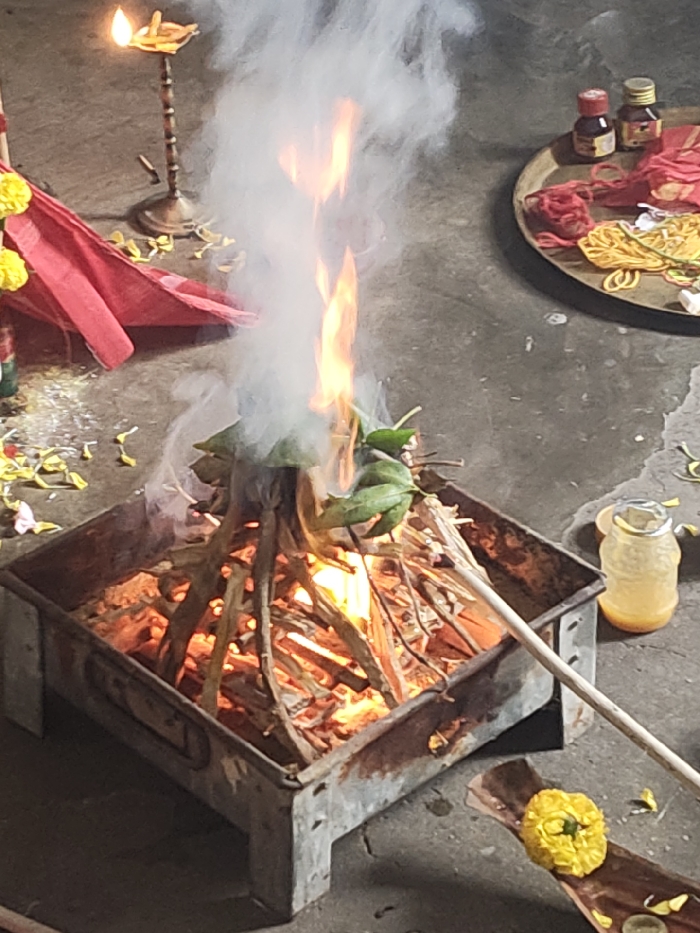 The image captures a Hindu religious ritual, specifically a Homa or Havan, occurring in Kolkata, India
