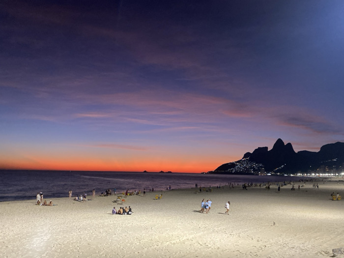A sunset view of a beach with people enjoying the evening. The sky transitions from orange at the horizon to shades of blue and purple above. Mountain silhouettes are visible in the distance, with lights dotting their base, indicating a city. The beach is illuminated, highlighting the sand and the figures of people scattered across it, some sitting, some walking. The ocean's surface reflects the vibrant colors of the sunset.