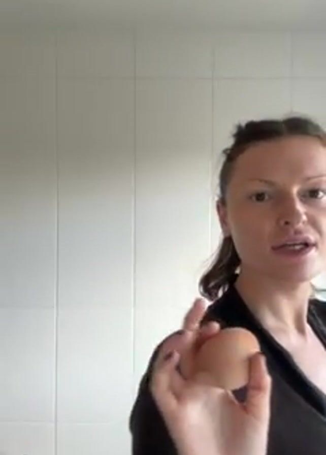 A woman is holding a half-shell of an egg and speaking into the camera. She pulls back her hair into a small ponytail. She is wearing a dark brown, V-neck shirt. Behind her is a wall covered in white square tiles. A sink and a can of hairspray are visible on the left side of the frame.