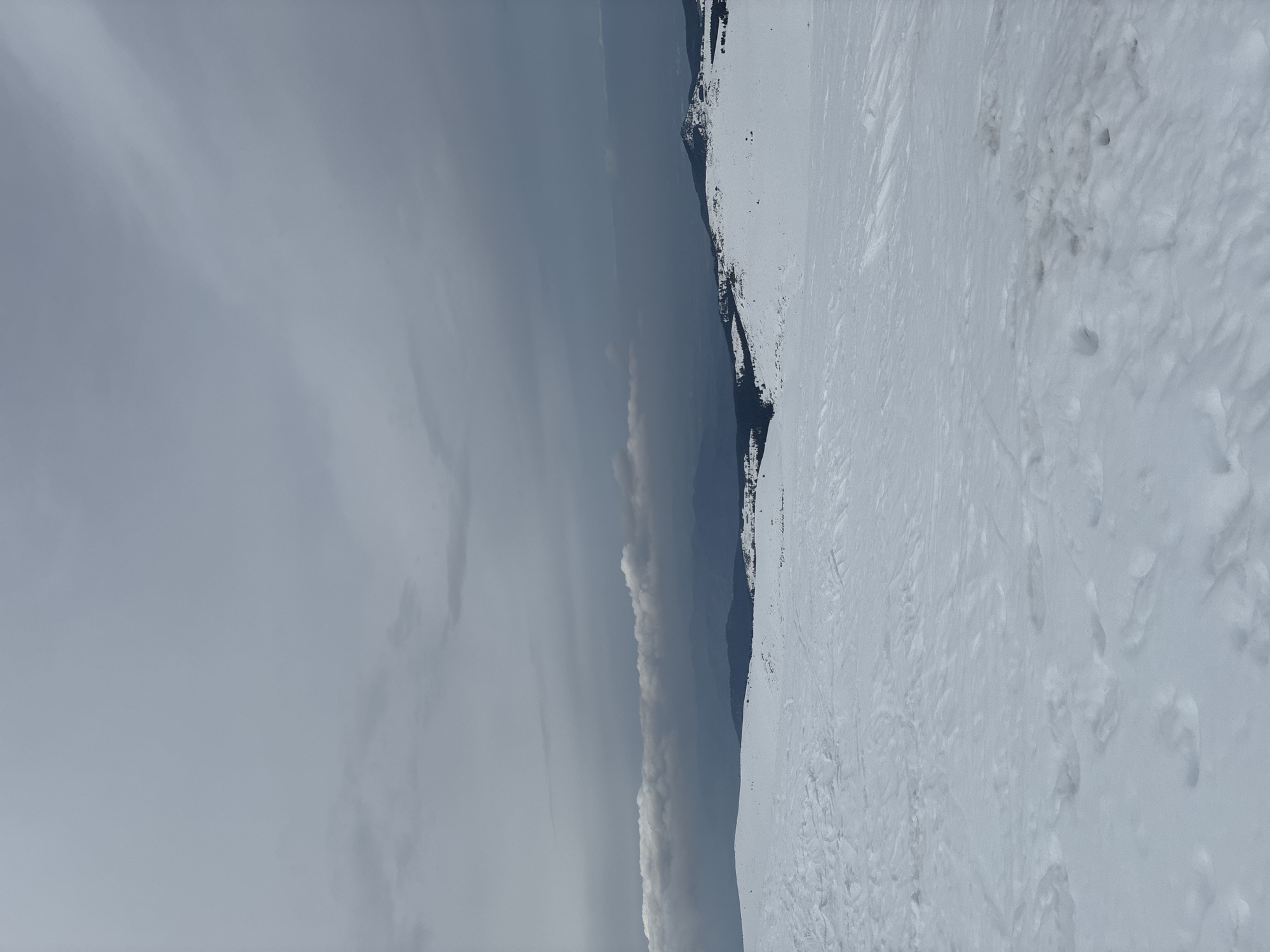 landscape of snowy terrain, likely in a mountainous region, under an overcast sky