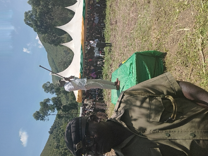 An outdoor gathering in Manda-Shivanga ward, Kenya, is depicted under a clear blue sky with scattered clouds and distant, densely forested mountains. In the immediate left foreground, a dark-skinned male individual is visible from the chest up, wearing an olive-drab short-sleeved uniform shirt with two chest pockets, shoulder epaulets, and a lanyard on the right shoulder. He wears dark-rimmed glasses and a dark cap with a metallic badge, and faces right. In the midground, a male speaker in a light-colored patterned shirt and light trousers stands on a green fabric-draped elevated platform. He holds a long, dark, staff-like object angled upwards with both hands. His footwear is red-brown. To the right of the speaker, a large white peaked tent with green and yellow trim covers a seated audience on white plastic chairs, all facing the speaker. Several other individuals, some in uniforms, stand behind the seated crowd. The ground in the foreground is dry earth with sparse patches of grass. The background consists of prominent green, tree-covered hills.