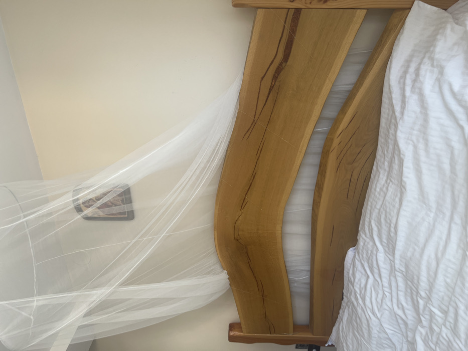 The image depicts a static interior scene, specifically a bedroom, located in the city of Dospey, Bulgaria. The central subject is a bed with a prominent, custom-built wooden headboard featuring two horizontally aligned, live-edge timber planks with natural, undulating contours. The wood exhibits a light brown hue with distinct darker grain patterns and visible surface scratches. This headboard is supported by vertical wooden posts on the right side. White, rumpled bedding, likely a duvet or comforter, is visible in the lower foreground, covering the bed. Above the headboard, a white, transparent mosquito net hangs from the ceiling, draped downwards and partially obscuring the upper portion of the headboard and the wall behind it. The wall is painted a plain, light cream or off-white color. Mounted on the wall, visible through the mosquito net to the upper right of the headboard, is a framed icon, appearing to be an Orthodox religious image, encased in a dark frame. No individuals are present in the scene.