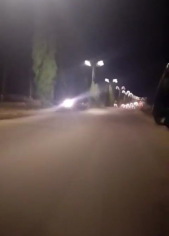 blurry view of a paved road at night, illuminated by streetlights. There are trees planted along the sides of the road. The camera appears to be moving forward. Car lights are visible in the distance. The quality of the video is low, and the image is shaky. The text "TECNO SPARK 10c" is visible in the corner of the screen, indicating the device used to capture the video.