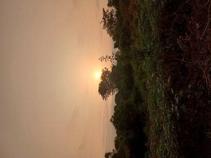 A serene landscape bathed in the warm glow of the sun. The sky is a soft gradient of peach and orange, with a hint of cloud cover. The sun appears to be partially obscured by silhouetted trees, casting a hazy light. Lush greenery covers the ground, with dense foliage and scattered shrubs. The scene exudes a sense of tranquility and natural beauty.