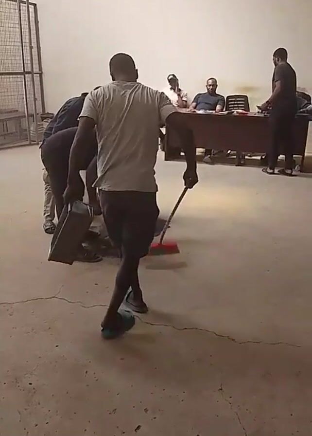 In a large room, with bare walls, concrete floor with cracks, there are three men cleaning up a dark wet patch on the floor. One man holds a large briefcase, another sweeps with a red broom, and a third scoops with a bucket. Three men are sitting behind a desk against the wall, facing the scene. One man stands behind the desk. There is a barred enclosure in the corner of the room.
