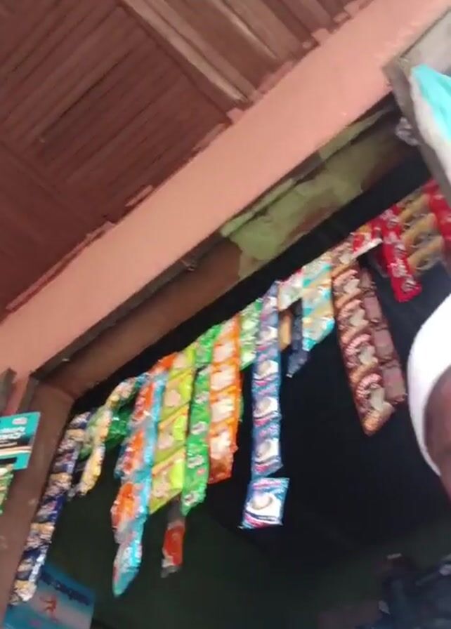 close-up of a man's face as he looks at the camera. The man has dark skin, a white cap and scarf, and is wearing a blue shirt. He smiles briefly and then stares seriously. The background shows a small shop or stall with a variety of goods hanging from the ceiling, including small packets of food or drink. There is also a calendar and other items visible. The shop appears to be in an outdoor or semi-outdoor setting. The ceiling of the shop is made of brown wooden planks.